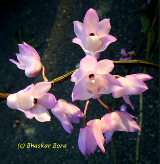 This warm growing epiphyte with a thick creeping rhizome is found in Assam, Arunachal Pradesh, Khasia , Jyantea Hills and Bhutan at elevations of 800 to 1800 meters. leaves are lanceolate and thickly coriaceous. Flowers are pale white with pink lip.